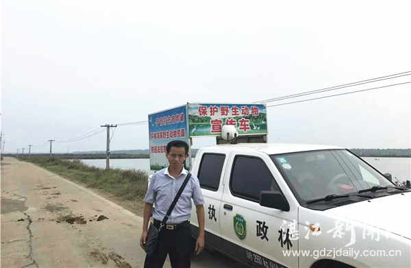 徐粤心带雷州市林业局林政股同志在南渡河口巡查护鸟。