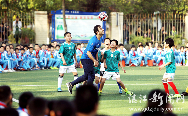 “五超进校园活动”在坡头区第一小学举行,图为湛江恒兴队员与小球员进行交流赛。记者 张锋锋 摄