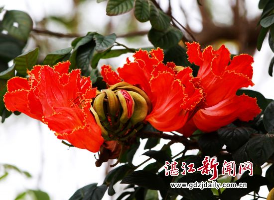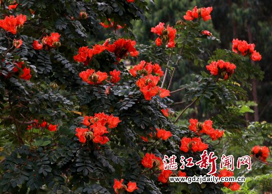 湛江新闻网讯:推窗见绿,四季有花。如今,在湛江市区的许多市政道路两旁,都能看到火焰木的身影,不负好春光。4月7日,笔者在湛江开发区龙平北路看到,湛江市第二中学大门口两旁的火焰树树影婆娑,枝叶繁茂。花开于树冠之上,像极了一朵朵火焰,真是树如其名。仔细观察,深红色的花瓣边缘镶嵌着一圈金黄色的花纹,火焰花盛如火,花姿优美,色彩十分艳丽,不少市民乘车或步行从树下穿越,享受湛江美好春光。