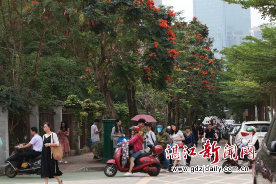 众多市民乘车或步行从火焰树下穿越,享受湛江美好春光