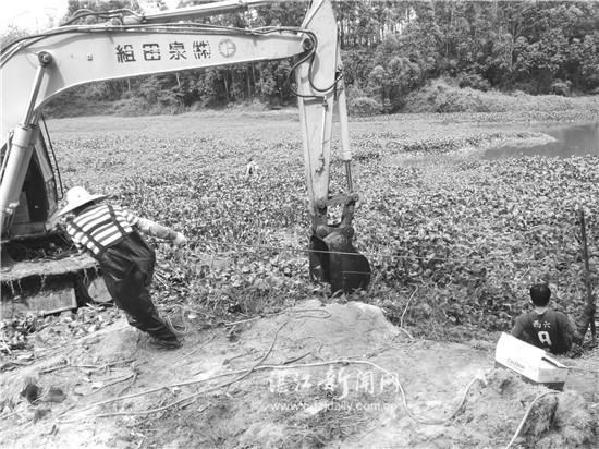 8日上午,湛江市雷州青年运河管理局赤坎水库管理所的工作人员一上班,就到赤坎水库云溪桥旁边的小水库进行水浮莲清除工作。据赤坎水库管理所相关负责人介绍,赤坎水库的水面,由云溪桥为界分为两部分,云溪桥下游的水面达613亩,5名工作人员,每天开着快艇巡逻清理水浮莲、生活垃圾和水面漂浮物等,以保证赤坎水库水质的清洁无异味、饮用水安全。云溪桥上游水面为100多亩,从麻章流下来的南溪河水先流经此处,随着河水冲下来的水浮莲,也先在这里聚集。现在是水浮莲生长的旺盛期,只需一两天水浮莲的浸占面积就会翻倍增长,所以必须尽快清理。据了解,这一次清理这100多亩的水浮莲,需要20个工作人员、一台钩机、两三艘快艇,联合清理3天,将清理出570吨水浮莲。