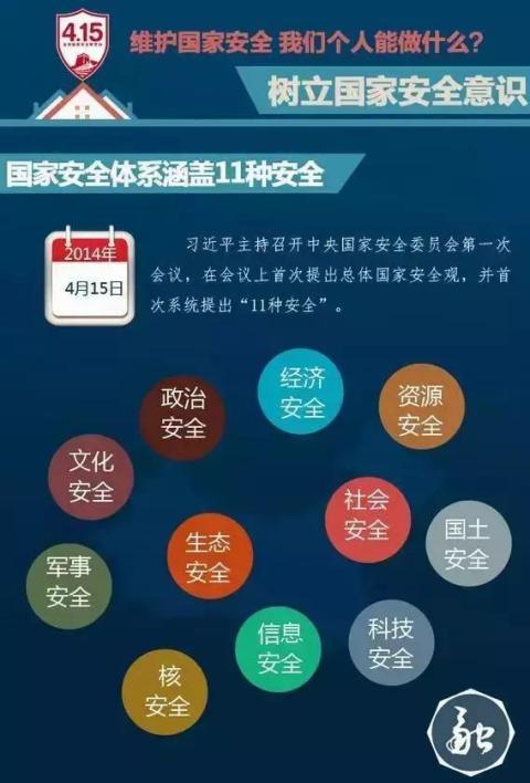 “11种安全”,即政治安全、国土安全、军事安全、经济安全、文化安全、社会安全、科技安全、信息安全、生态安全、资源安全、核安全。