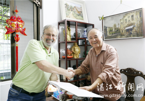 意大利日前成为G7集团中首个签署“一带一路”倡议谅解备忘录的国家,在民间,中意文化交流也日益频繁。昨天上午,有“文化使者”之称的意大利著名画家路易吉·莫德良诺与湛江籍妻子梁雪梅,在侨办工作人员陪同下,慕名拜访湛江著名油画家阎大钧。