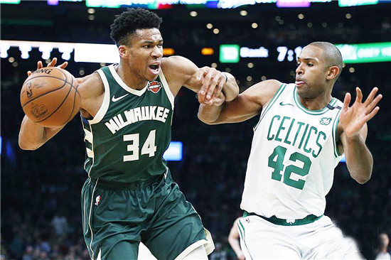 上图为雄鹿队球员安特托昆博(左)和凯尔特人队球员霍福德在比赛中拼抢。