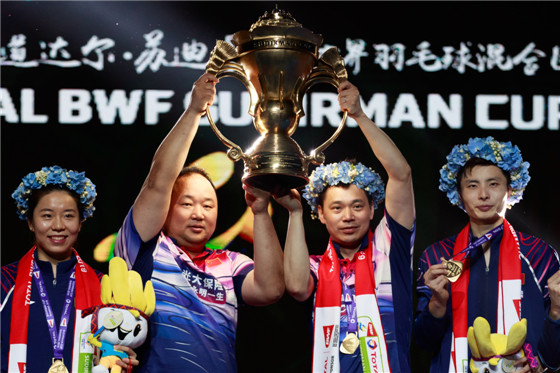 3:0!凭借出色的发挥,年轻人挑大梁的中国羽毛球队26日在主场完胜实力强劲的日本队,第11次捧起象征世界羽毛球国家整体实力的苏迪曼杯。