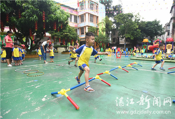 廉江市第一幼儿园的小朋友们在做户外活动。