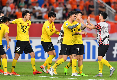 6月25日,广州恒大队球员庆祝获胜。