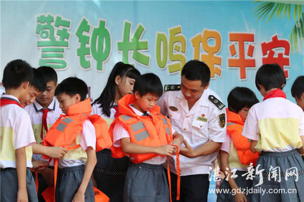 7月5日上午,团赤坎区委、赤坎区教育局、湛江霞海海事处和市四小联合开展2019赤坎区青少年和儿童应急避险自护安全教育活动。图为学生在学习穿救生衣。记者 林石湛 摄