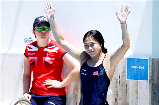 7月6日,完成女单3米板跳水决赛的最后一跳后,吴春婷高兴地庆祝胜利。 新华社发