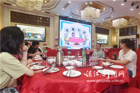 湛江金海酒店中餐厅的LED屏经常播出“光盘行动”宣传语,提醒市民按需点餐,适量点餐,