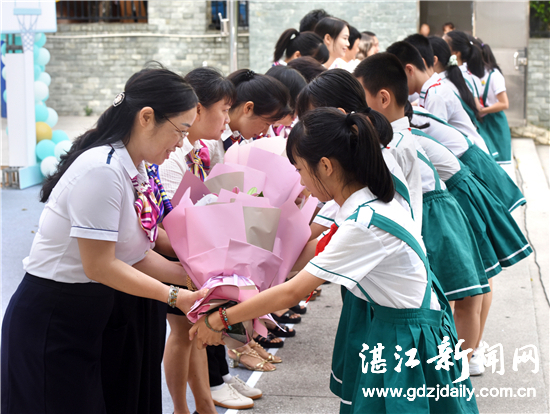 毕业生代表向老师献花。