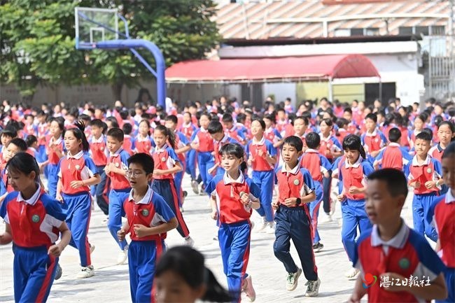 11月17日上午9时许,正是湛江市二十八中学的课间十分钟时间,在操场上,身着统一校服的小学五六年级的学生排起整齐的队伍,随着哨声响起,学生们跟着广播跑操,操场上瞬间热闹起来。