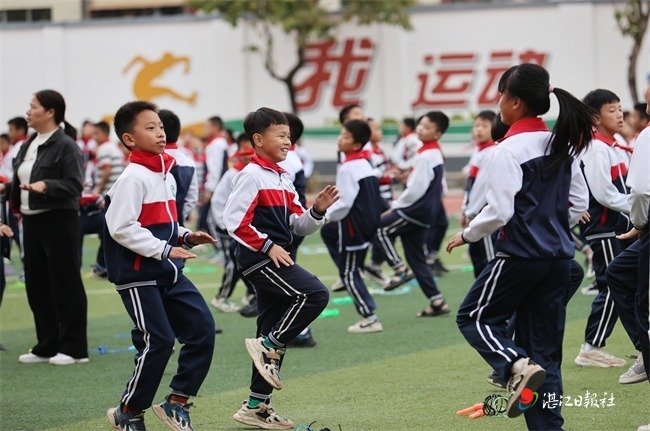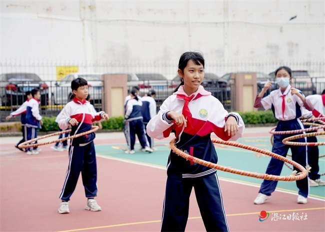 11月中下旬的湛江,天气渐凉。但下课时间,在湛江市二十八中学的操场上,记者感受到了运动热浪。在操场上,高年级的学生排着整齐的队伍在跑操;另一边的篮球场及空地上,三四年级的学生也在老师的指导下,玩起跳绳、呼啦圈、篮球、乒乓球等;一二年级的学生则在教室里跟着老师做起课间操,十分欢乐。每一张稚嫩的脸颊都因运动而神采焕发。