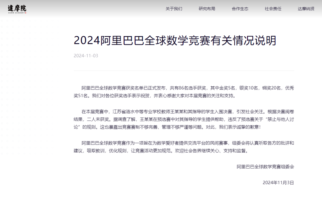 阿里巴巴全球数学竞赛获奖名单已正式发布,共有86名选手获奖,其中金奖5名,银奖10名,铜奖20名,优秀奖51名。我们对各位获奖选手表示祝贺,并衷心感谢大家对本届竞赛的关注和支持。在本届竞赛中,江苏省涟水中等专业学校教师王某某和其指导的学生入围决赛,引发社会关注。根据决赛阅卷结果,二人未获奖。据调查了解,王某某在预选赛中对其指导的学生提供帮助,违反了预选赛关于“禁止与他人讨论”的规则。这也暴露出竞赛赛制不够完善、管理不够严谨等问题。对此,我们表示诚挚的歉意!阿里巴巴全球数学竞赛作为一项旨在为数学爱好者提供交流平台的民间赛事,组委会将认真听取各方的批评和建议,吸取教训,优化规则,让竞赛活动更加规范。欢迎社会各界继续关心、支持和监督。