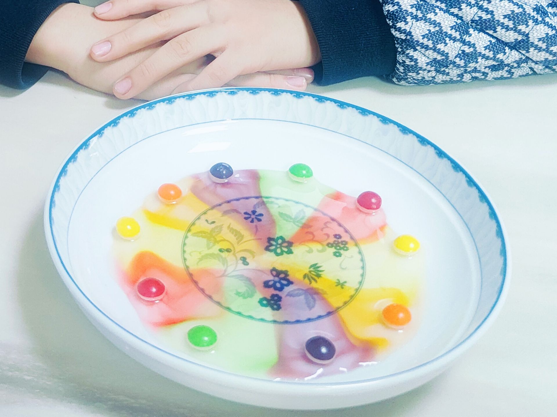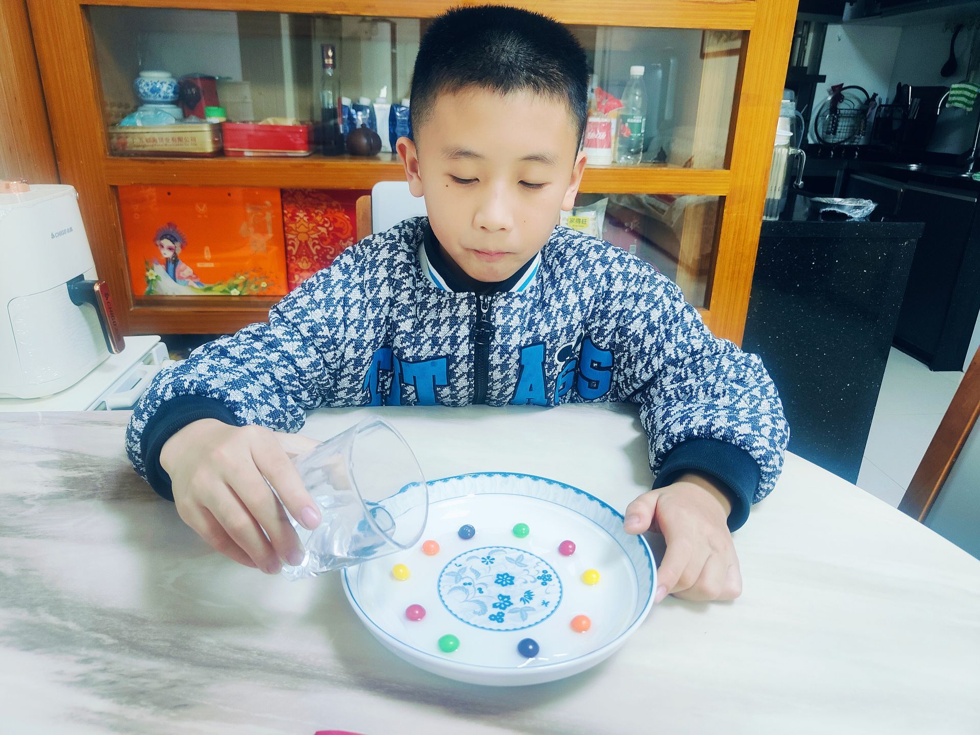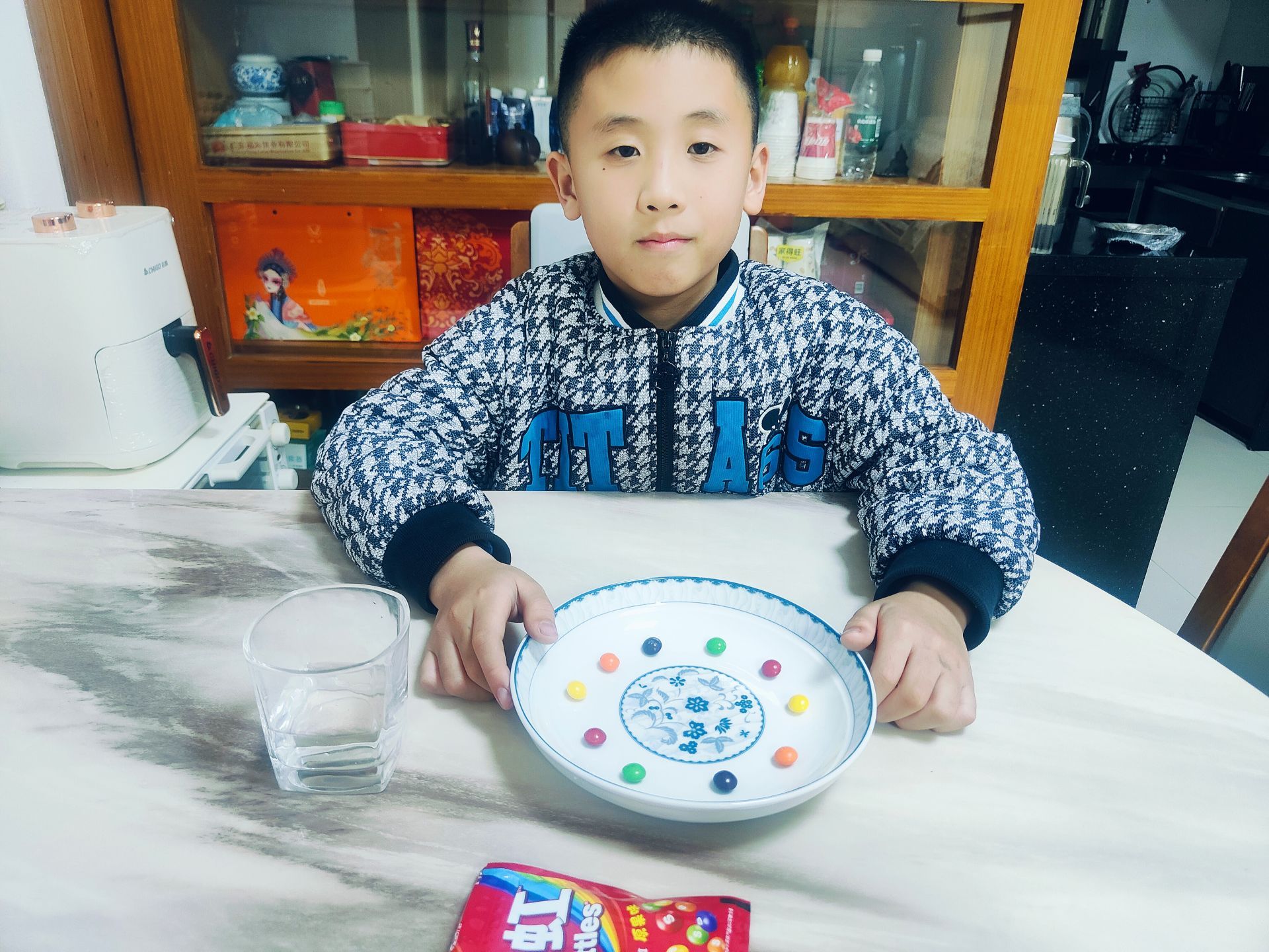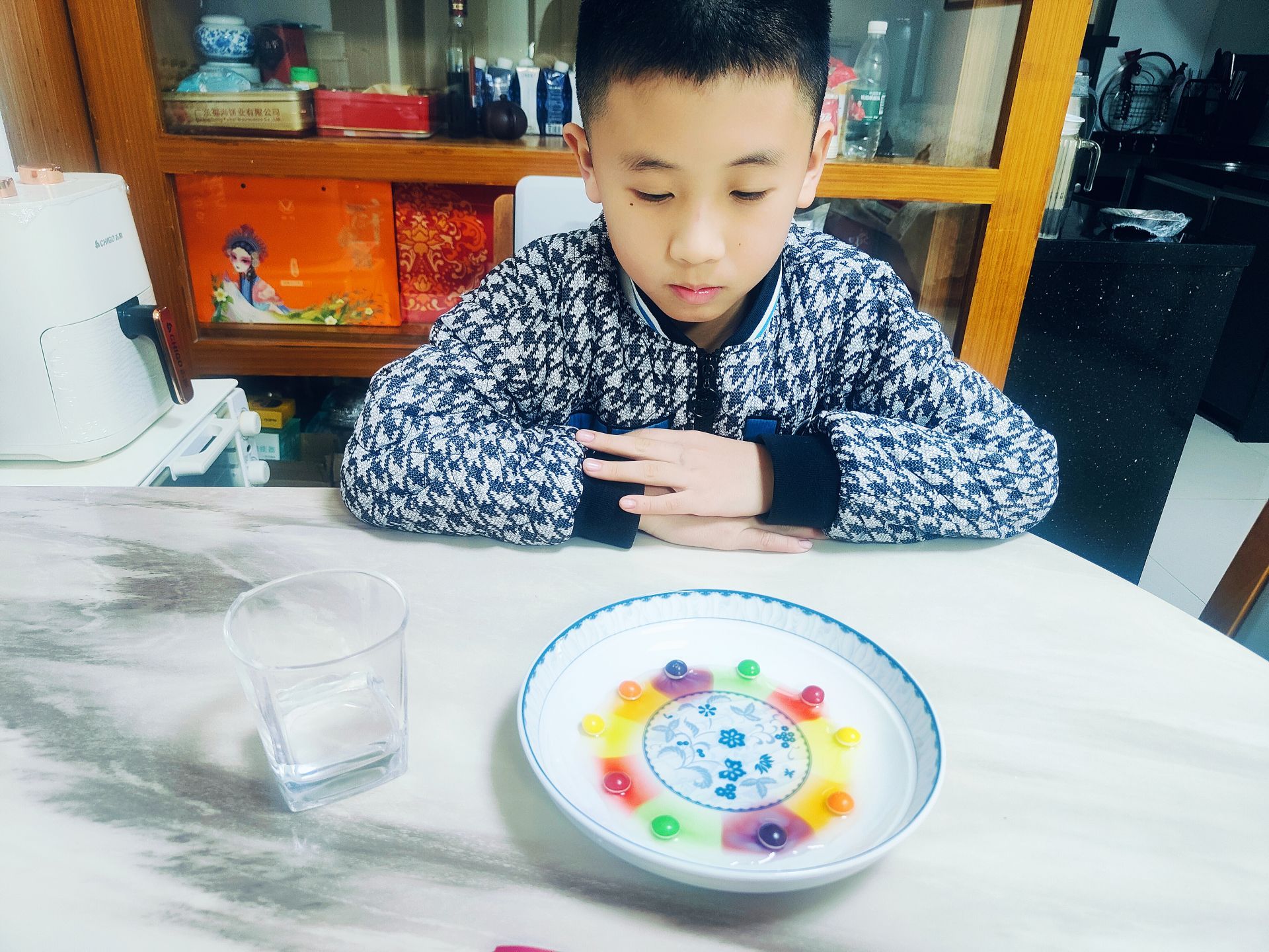 实验原理:水接触彩虹糖后,色素开始溶解于水,水的密度增大并向密度小的区域没有方向地四处扩散。当某颗彩虹糖色素与另外一颗彩虹糖色素相遇时,由于密度相似,于是两种颜色均朝盘子中央密度更小的区域扩散,最终形成类似彩虹摩天轮的形状。