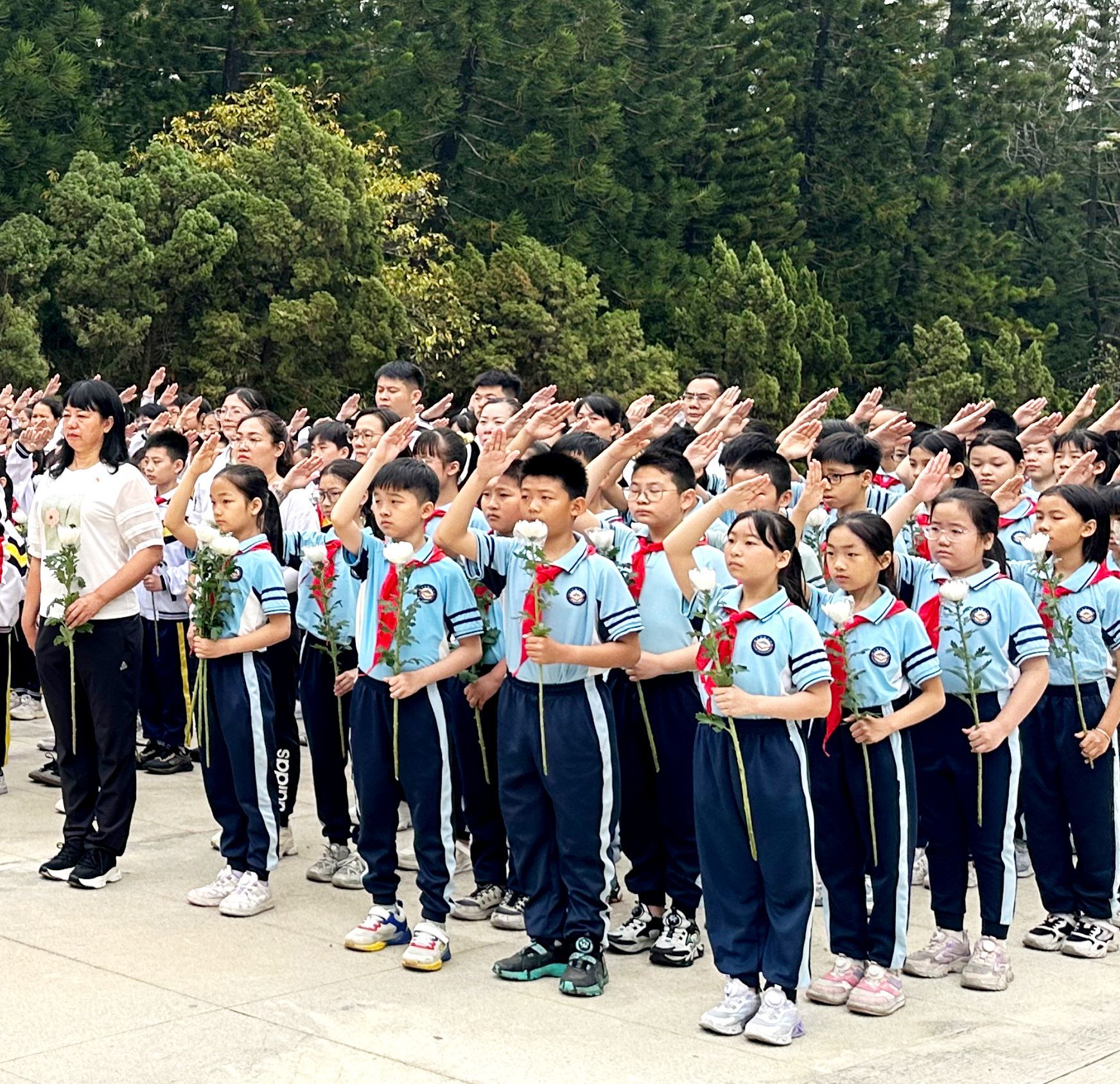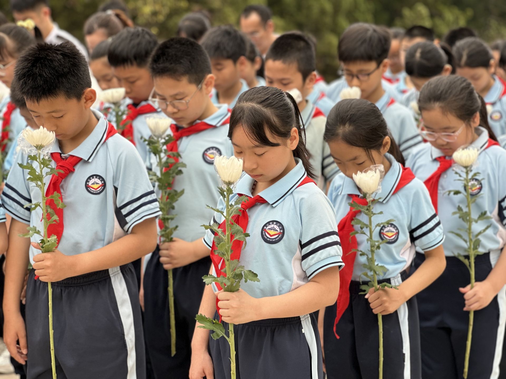 当天清晨,集团成员校(校区)师生列队肃立于革命烈士纪念碑前,队旗猎猎,红领巾随风轻扬。少先队员代表手抬花圈缓步前行,白菊与松枝交织的花环承载着稚嫩却炽热的敬意。全体师生垂首默哀。