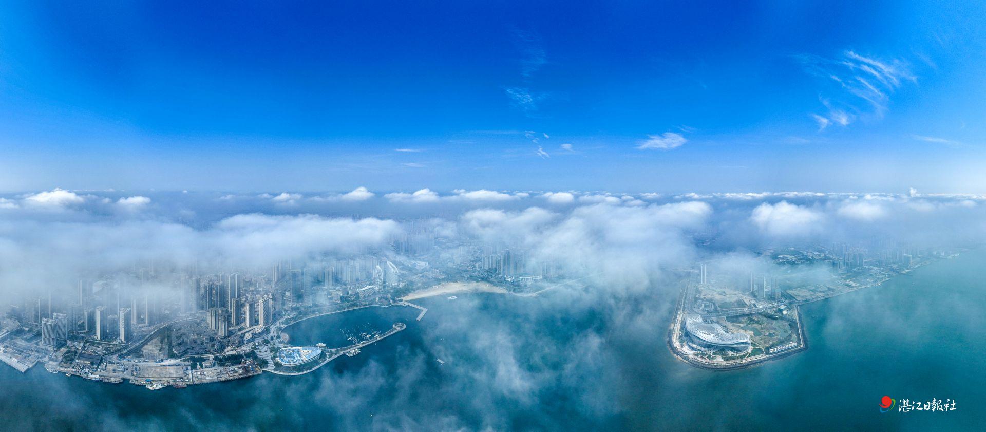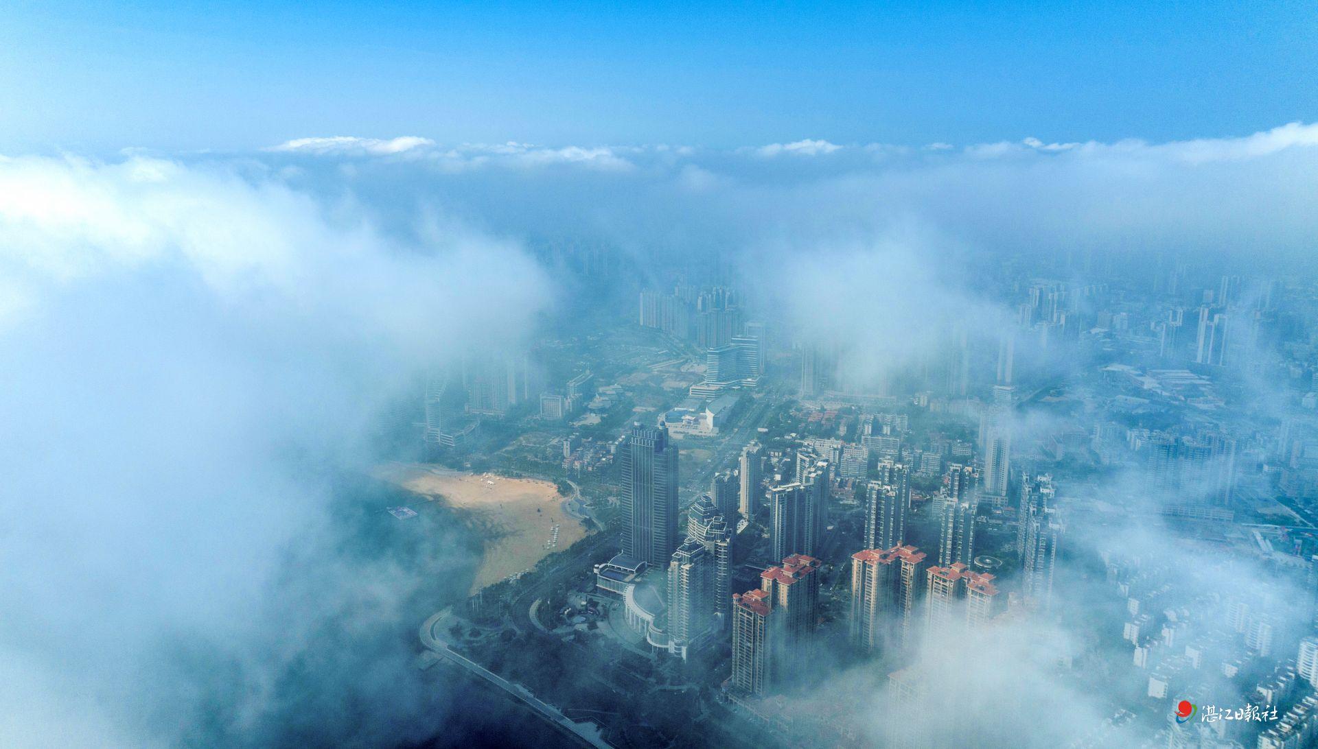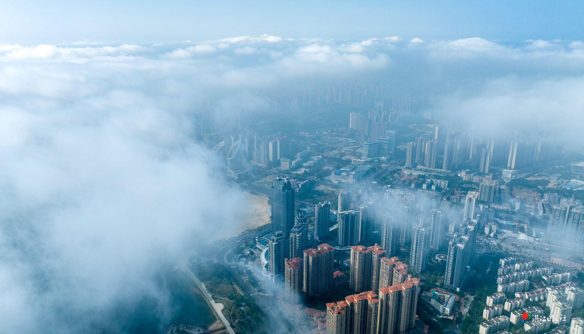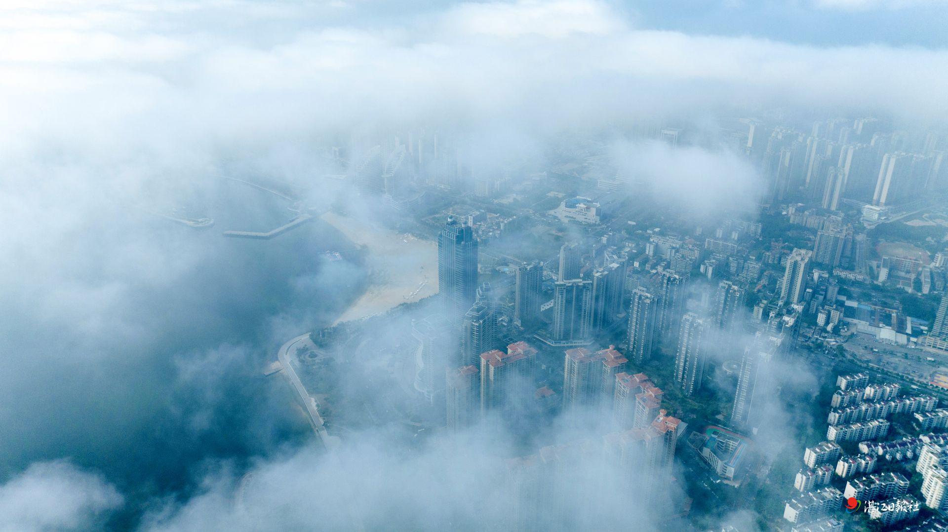 4月22日上午9时许,从无人机的高空视角欣赏港城上空的云海景观。当日,港城上空云层高度不足300米,9时许聚集的云层慢慢散开,透过流动的云层,阳光散射在城市景观之上,朦胧的城市在云海的映衬下若隐若现,美不胜收。