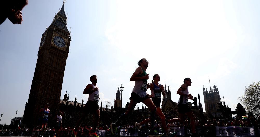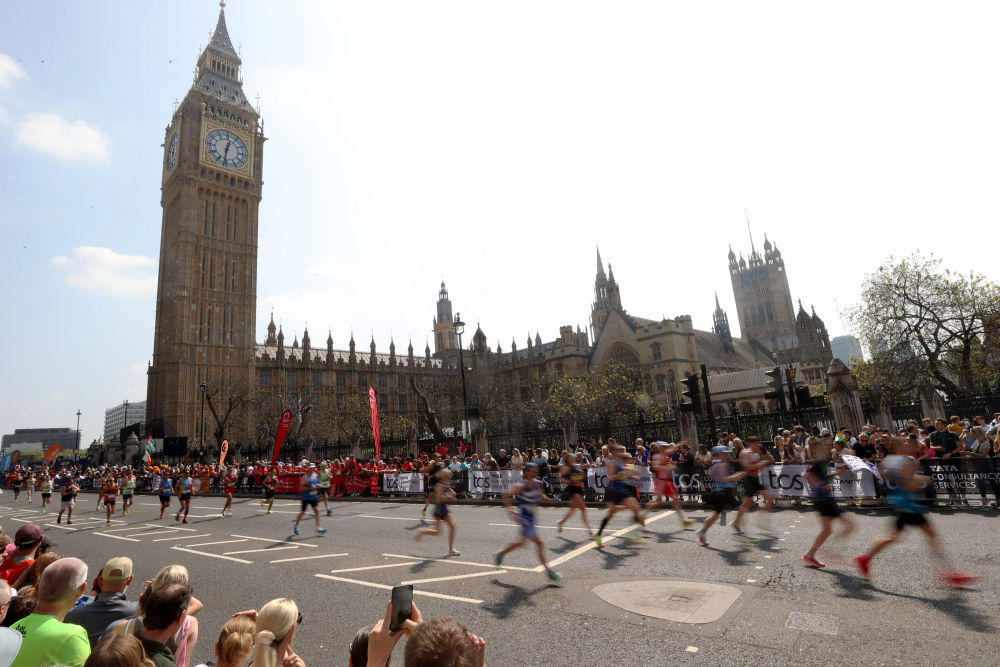 4月27日,选手们跑过大本钟。当日,2025伦敦马拉松赛举行。新华社记者 李颖 摄