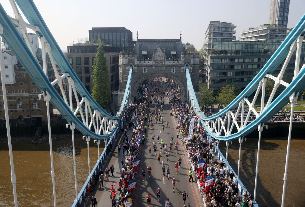 4月27日,选手们从伦敦塔桥上跑过。当日,2025伦敦马拉松赛举行。新华社记者 李颖 摄