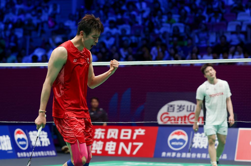 男单比赛由李诗沣对阵王高伦,双方在前两局势均力敌战成1:1。决胜局中,李诗沣抓住对手体能下降空档,确立领先优势,21:13赢下这场耗时85分钟的对决。
