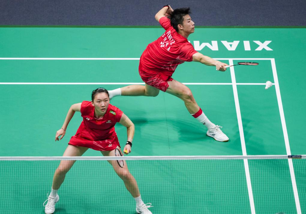 4月30日,中国队组合冯彦哲(上)/魏雅欣在混双比赛中回球。新华社记者 孙非 摄