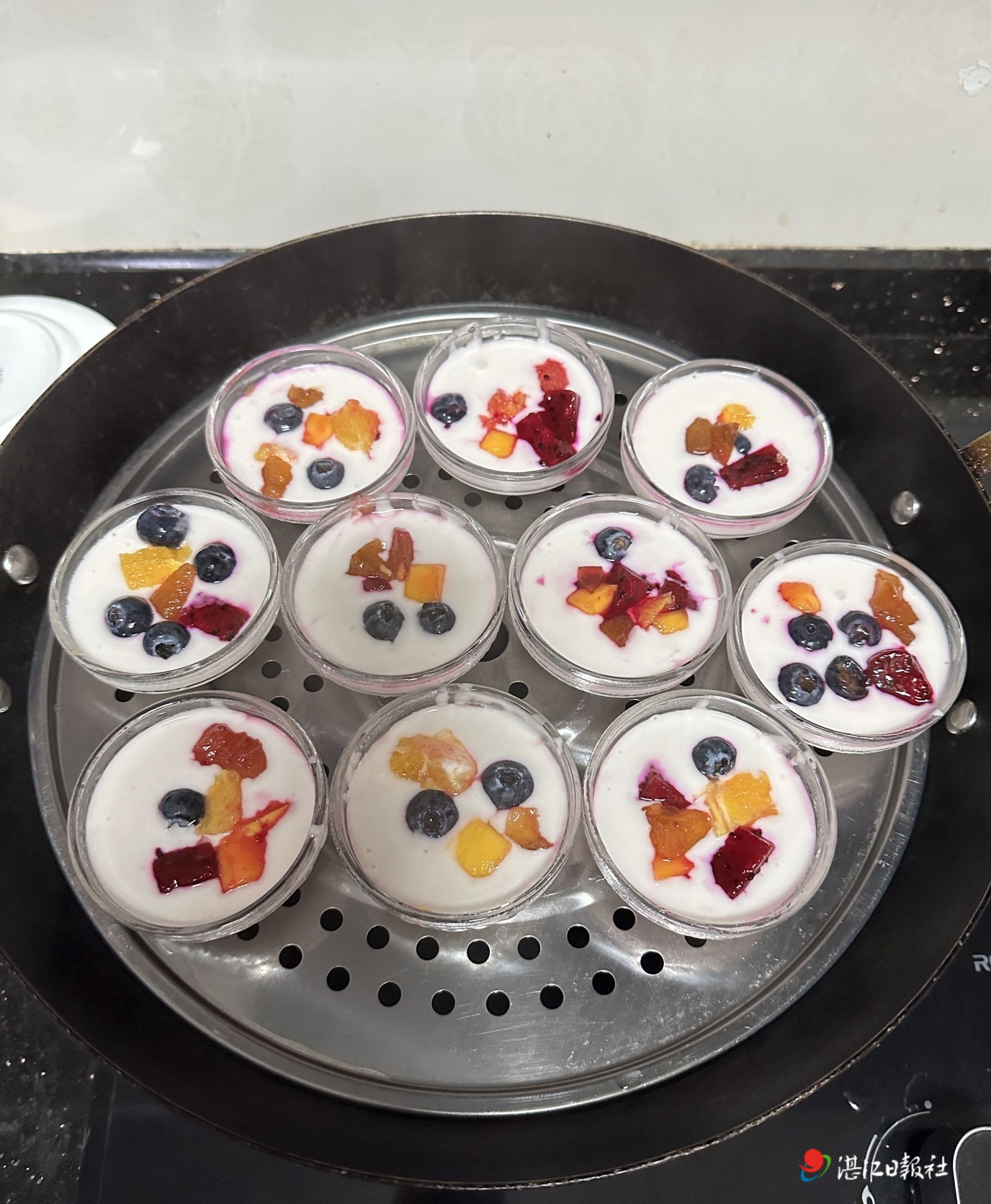 制作步骤:我先把白砂糖倒入温水中,拿起勺子慢慢搅拌。一开始,白砂糖沉在水底,随着我的搅拌,它渐渐消失不见,水也变得甜甜的。接着,我把100克钵仔糕粉小心翼翼地倒入糖水中。一开始搅拌的时候,粉浆里有好多小颗粒,我有点着急,担心做不好。不过我没放弃,继续用力搅拌,慢慢地,小颗粒都消失了,粉浆变得顺滑无比,像牛奶一样细腻。然后,我把搅拌好的粉浆缓缓倒入小钵仔模具,倒到七分满就好啦,再把切好的水果块放进小钵仔模具里。这时候的模具,就像一个个装满宝藏的小盒子,就等着上锅蒸了。