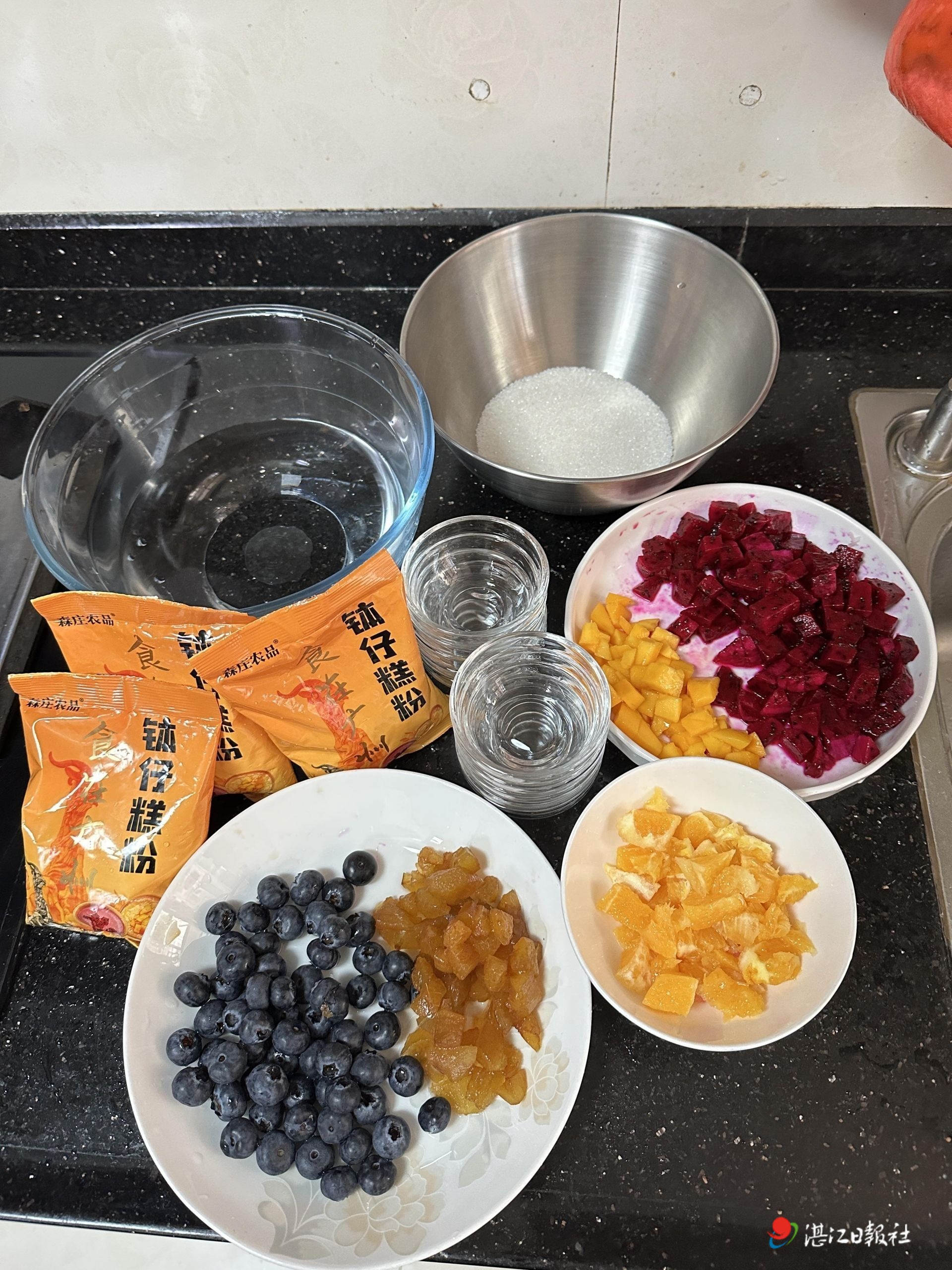 准备材料:100克钵仔糕粉,这可是做钵仔糕的关键原料。接着,拿出30克白砂糖,白砂糖在阳光下亮晶晶的,像一颗颗小宝石,等会儿它能给钵仔糕带来甜蜜的味道。还需要160克温水,温温的水可以让糖更好地溶解,也能让粉浆搅拌得更均匀。另外,我还准备了一些爱吃的水果,有蓝莓、火龙果、芒果和橙子等,切成小块备用。最后,找出了可爱的小钵仔模具,准备大展身手!