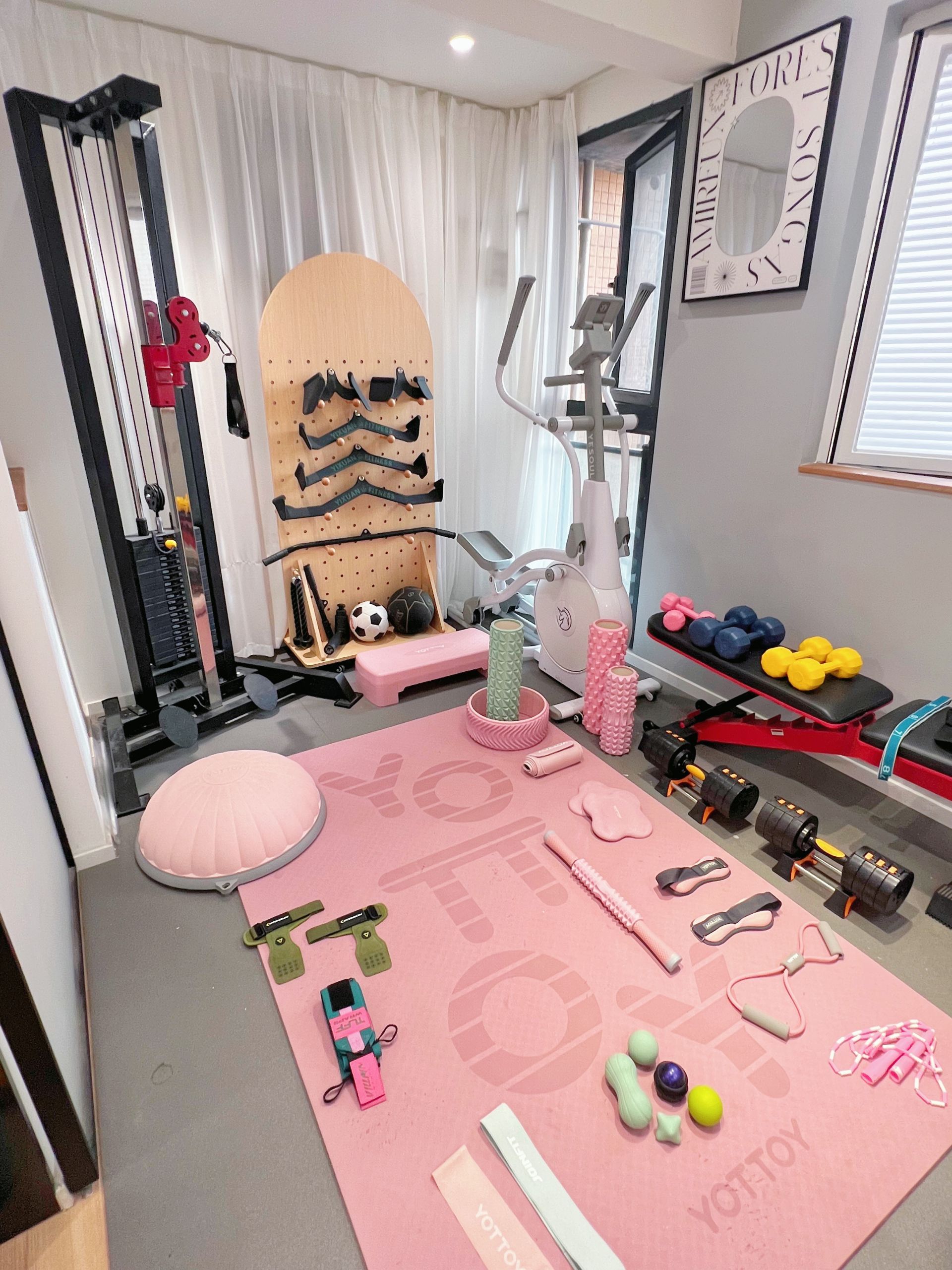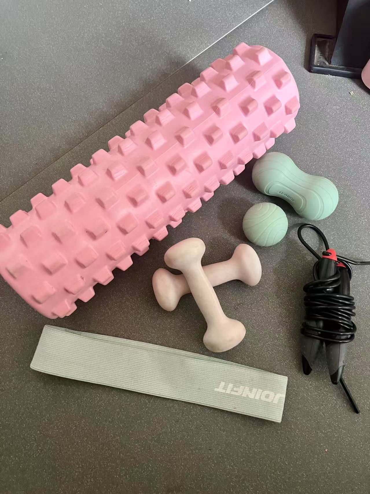 根据不同的运动需求,我们家配置了:瑜伽垫、瑜伽球、小重量哑铃、弹力带、跳绳、敏捷梯等。