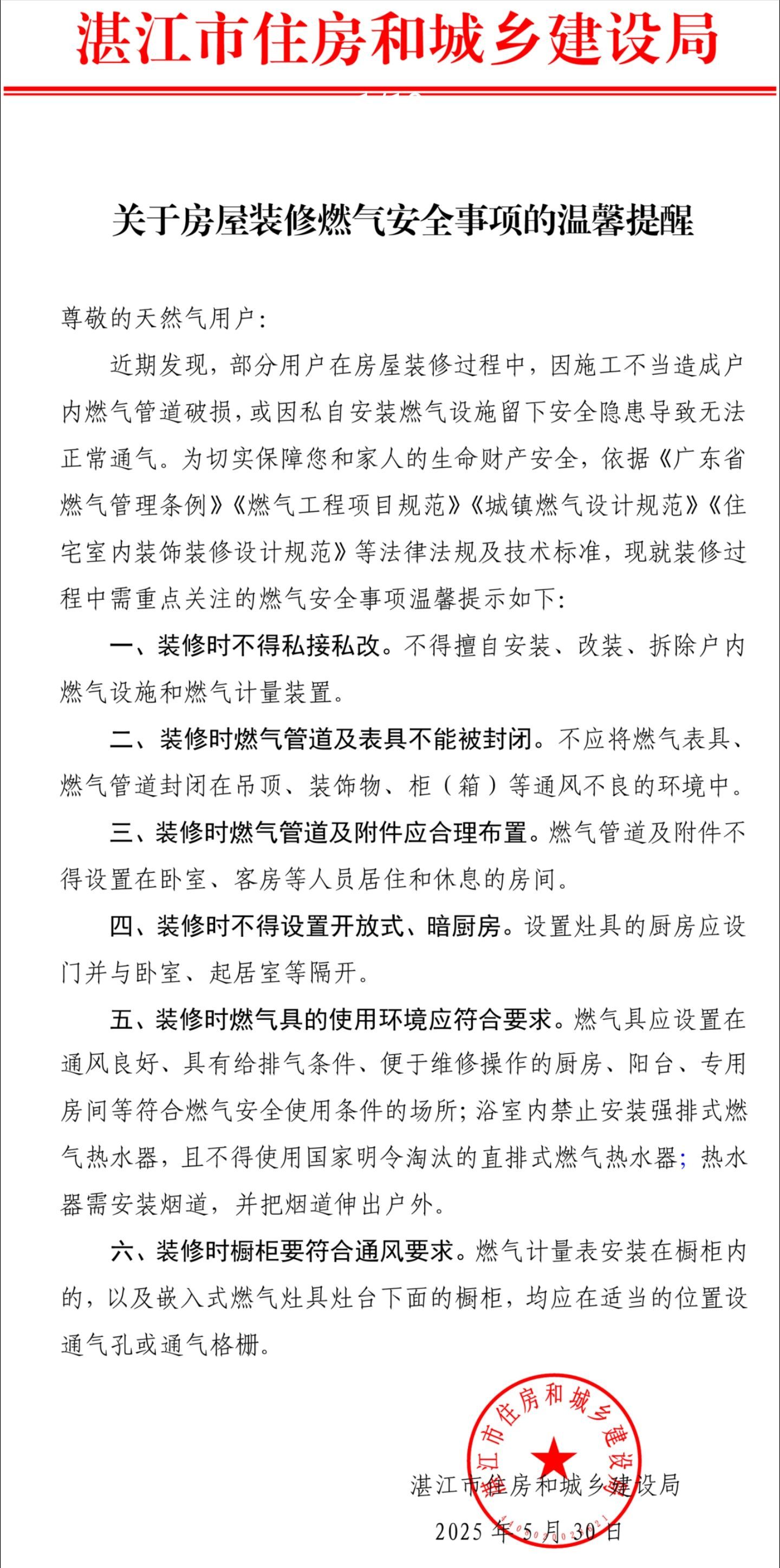 近日,市住建局发布《关于房屋装修燃气安全事项的温馨提醒》。