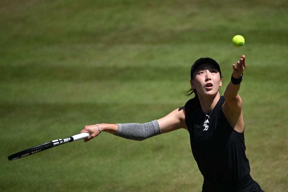 6月20日,王欣瑜在比赛中发球。当日,在WTA500柏林站四分之一决赛中,王欣瑜继续强势表现,顺利晋级四强。