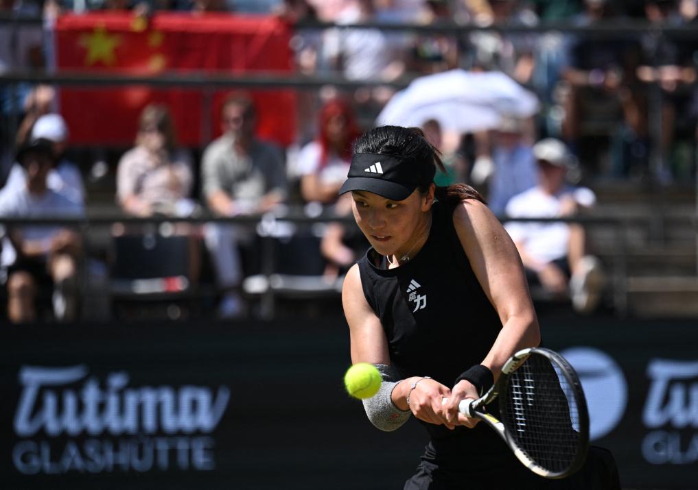 6月19日,王欣瑜在比赛中回球。当日,在WTA500柏林站第二轮比赛中,王欣瑜2:0战胜新科法网冠军、美国选手高芙,闯入八强。