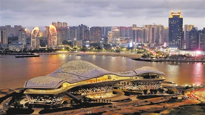 湛江文化中心夏夜璀璨,与金沙湾楼宇交相辉映。 记者欧阳泽 张锋锋 摄