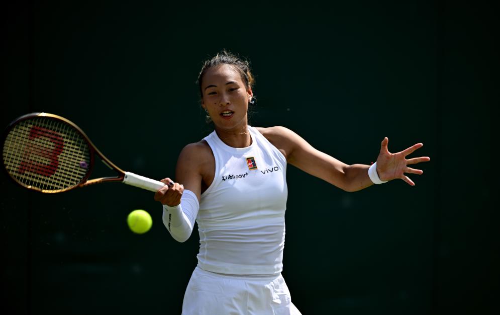 7月1日,郑钦文在比赛中回球。新华社记者 李颖 摄