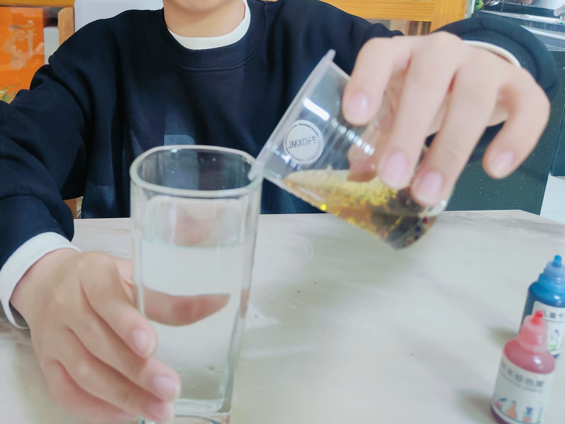 实验材料:一杯清水、食用油、色素、搅拌棒。