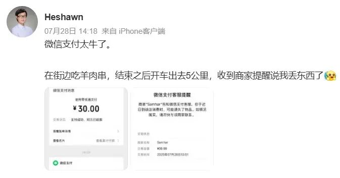 还有网友反馈,微信支付似乎出现了可以提醒付款人有遗失物的功能。