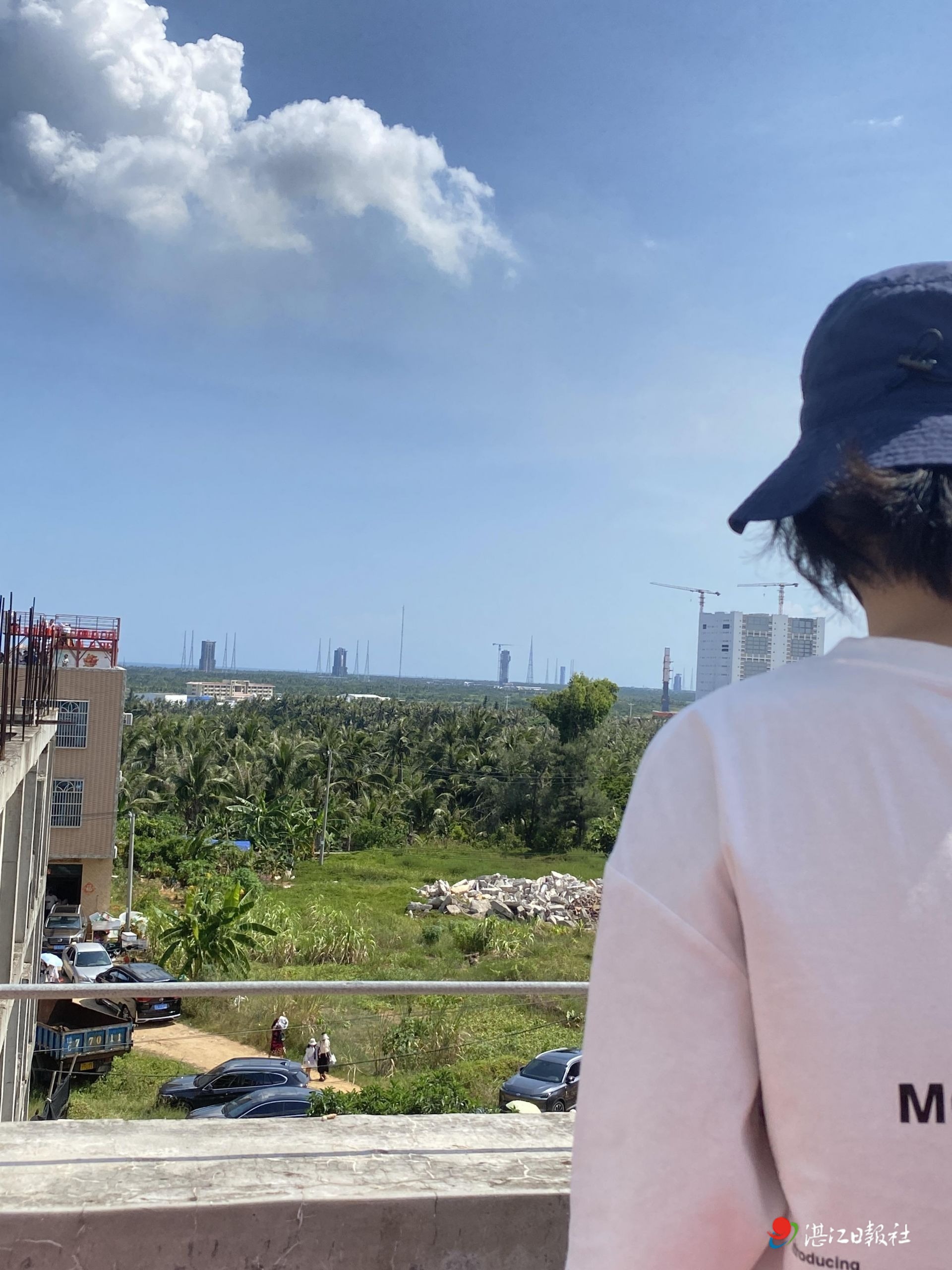 从文昌淇水湾沿岸的山海天国际会展中心楼顶远眺,数公里外的火箭发射场清晰可见。去年起,这座以承接会展、为周边居民提供文娱空间为主的建筑开辟了新业务——火箭观礼。