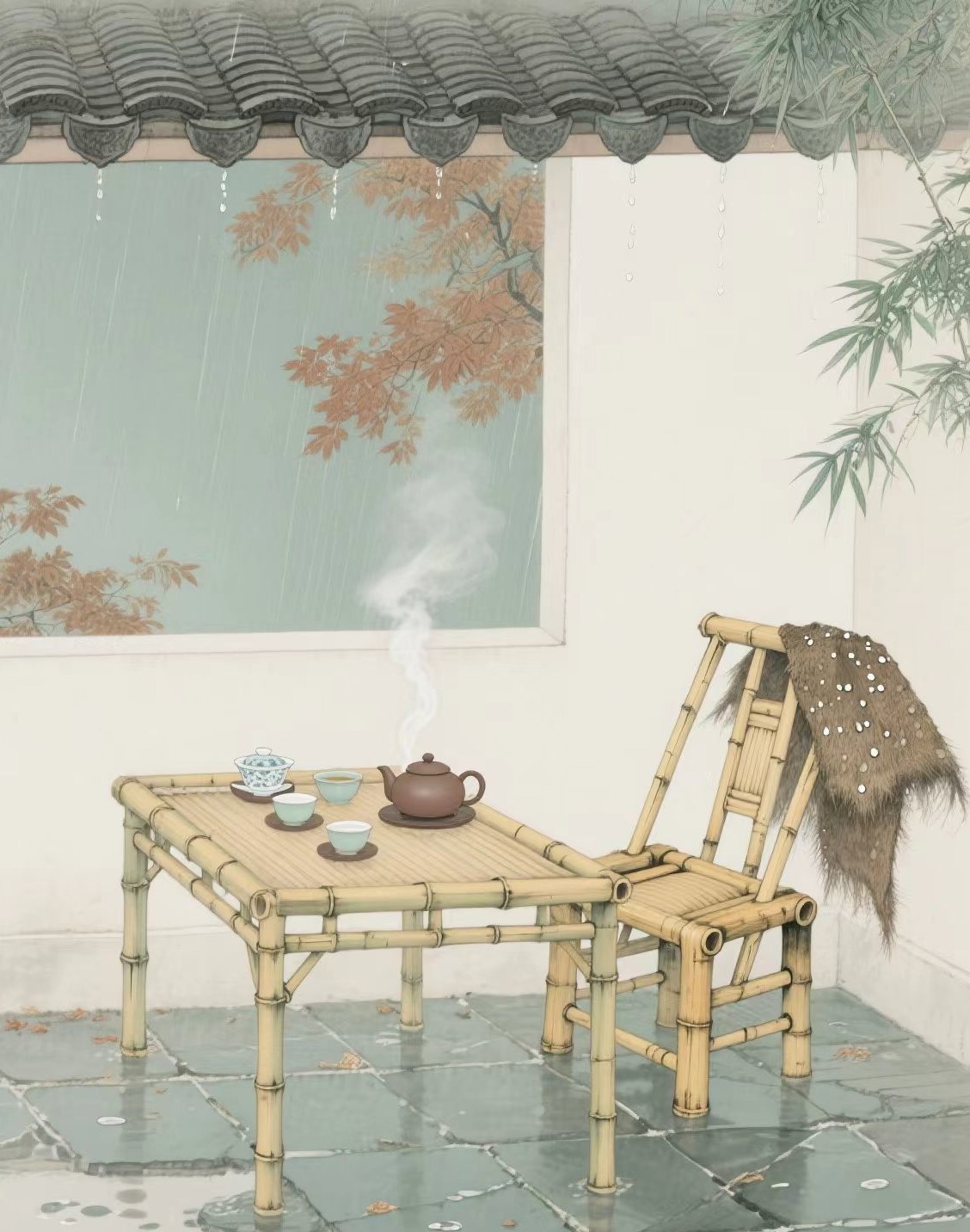 廊下的竹椅渐渐有些凉了。我起身想去屋里添件衣裳,可又舍不得这檐下的秋声,便又坐了回去。管它雨停不停呢,此刻的雨声、叶声、风声,已经够我记很久了。
