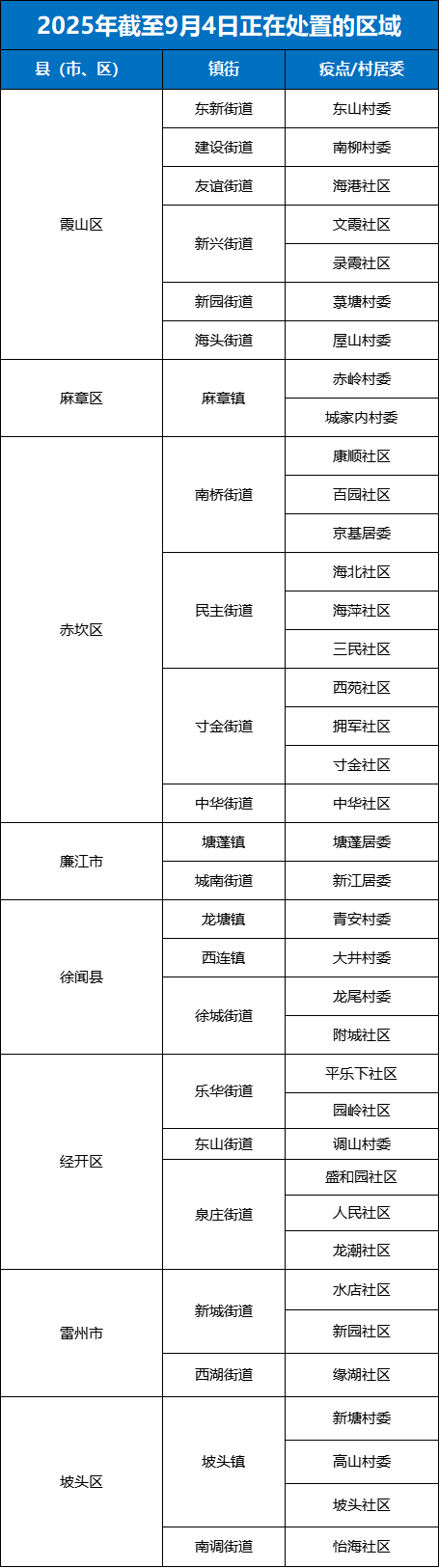 当前已进入基孔肯雅热等蚊媒传染病流行季节。湛江疾控提醒您,截至9月4日,以下区域正在开展蚊媒传染病疫情处置,存在传播风险,请注意防蚊灭蚊。