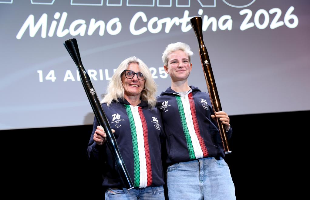 4月14日,冬奥会冠军斯特凡妮娅·贝尔蒙多(左)和残奥会冠军贝贝·维奥在米兰举行的发布活动上展示2026年米兰-科尔蒂纳丹佩佐冬奥会和冬残奥会火炬。新华社记者 李京 摄