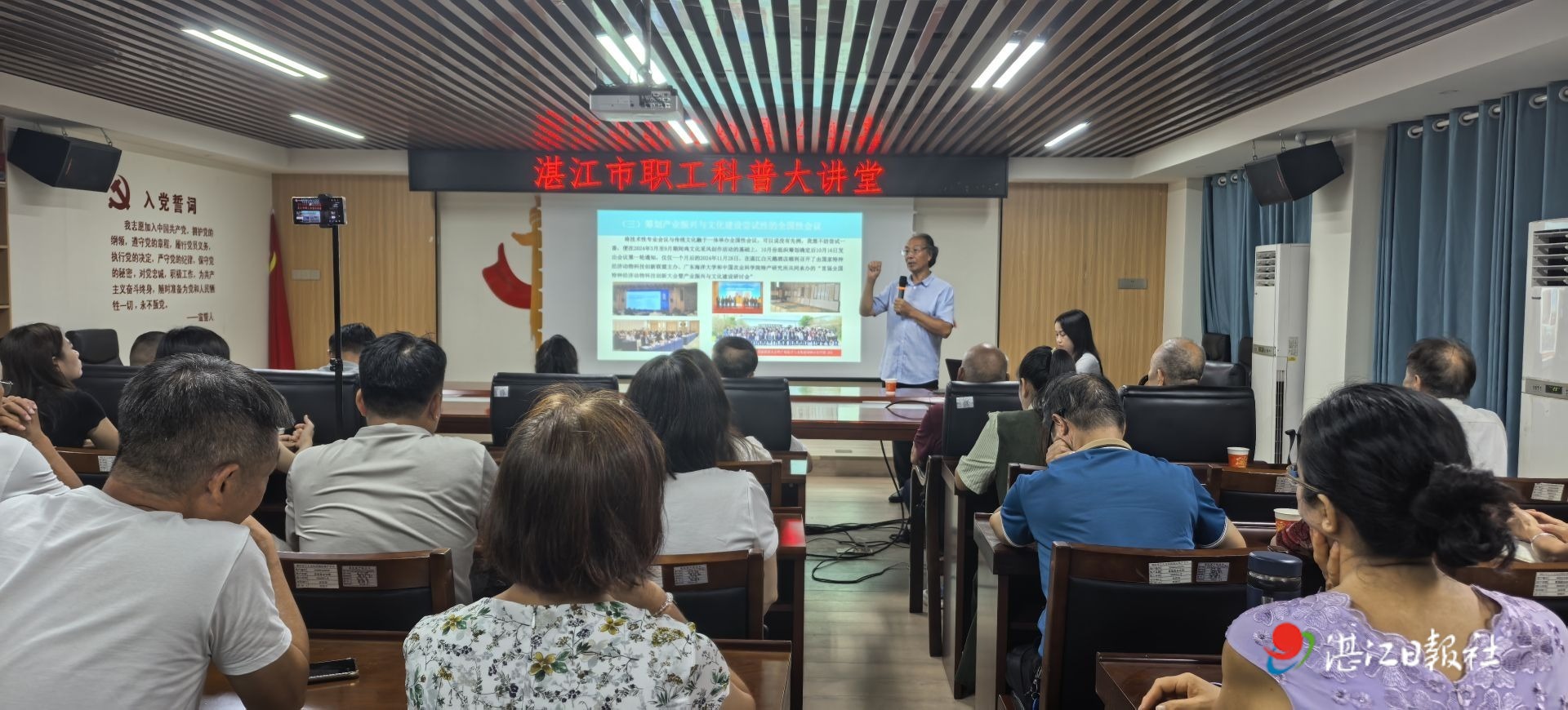9月19日,由市总工会、市社科联主办,市工人文化宫、霞山区文联、霞山区作家协会、半城雨读书会承办的2025年湛江市总工会职工科普课堂暨半城雨读书会第45期活动——“趣谈湛江鸡”在市工人文化宫举行。国务院特殊津贴专家、全国优秀科技工作者、原广东海洋大学二级教授杜炳旺担任主讲,从历史、文化、科技等多维度深入阐述了湛江鸡的独特价值与发展前景。
