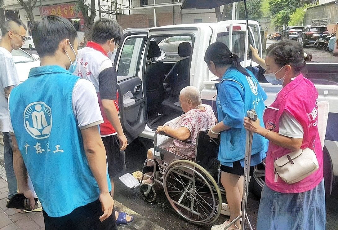 9月24日下午,由赤坎区民主街道、金城社区、社工站工作人员与志愿者等组成的帮扶队伍合力协助行动不便的老人从轮椅转移至安置车辆,用细致的关怀为特殊群体老人筑起安全“避风港”