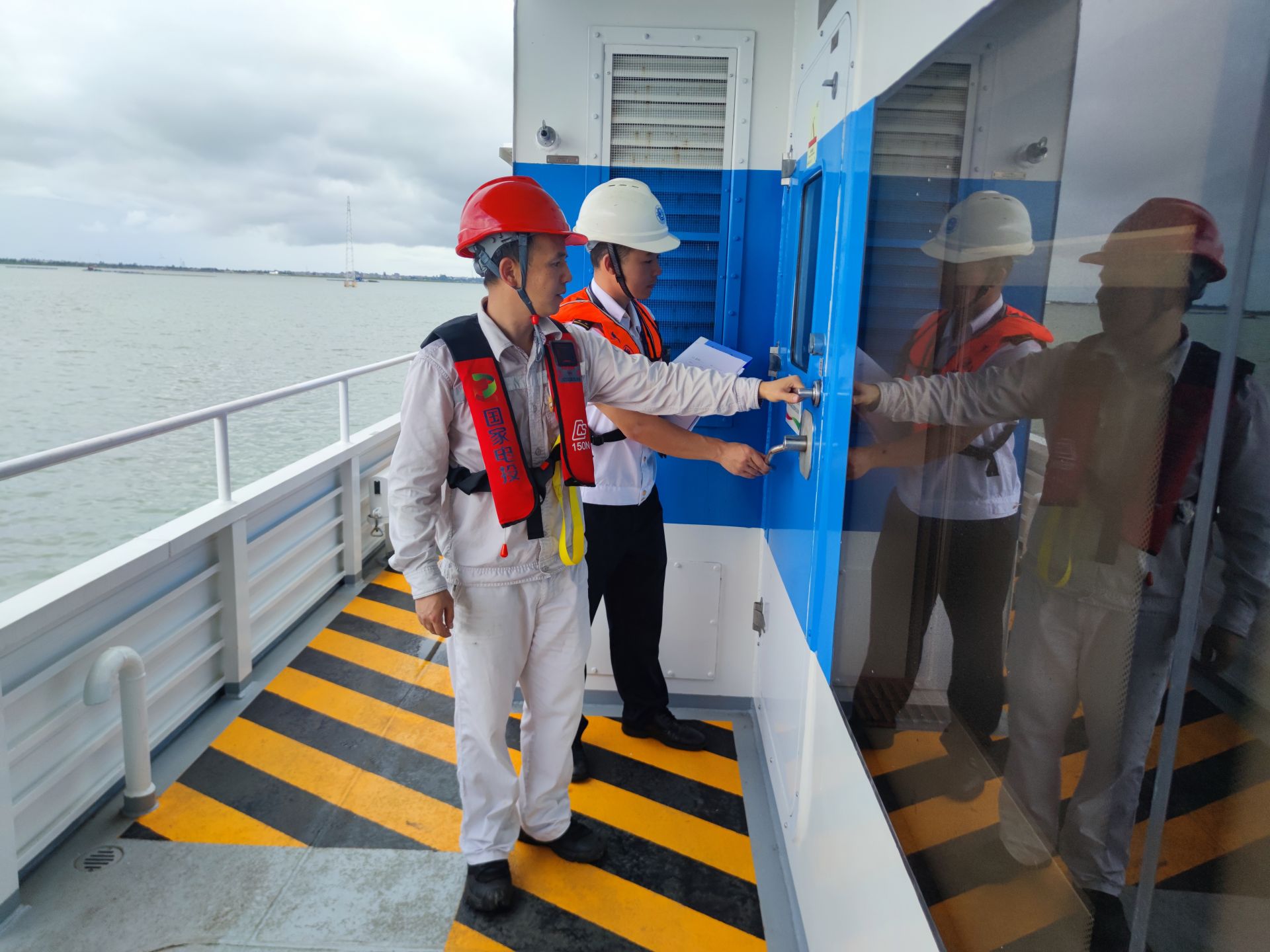 防台风备战阶段,党员、青年突击队主动冲锋在前,以“先‘风’而行”的姿态落实各项防御措施。队员们对照防台风手册检查表,对排水系统、事故油池、风机扭缆等关键部位展开“拉网式”检查与测试,全面清除杂物、排除积水,并在重点区域用木板和沙袋筑牢“防护墙”。同时,团队严格遵循广东省防总“六个百分百”要求,坚决执行“船回港、人上岸”指令,于9月22日前顺利完成65名船员和作业人员撤离,以及23艘船舶加固与离港避台风工作。
