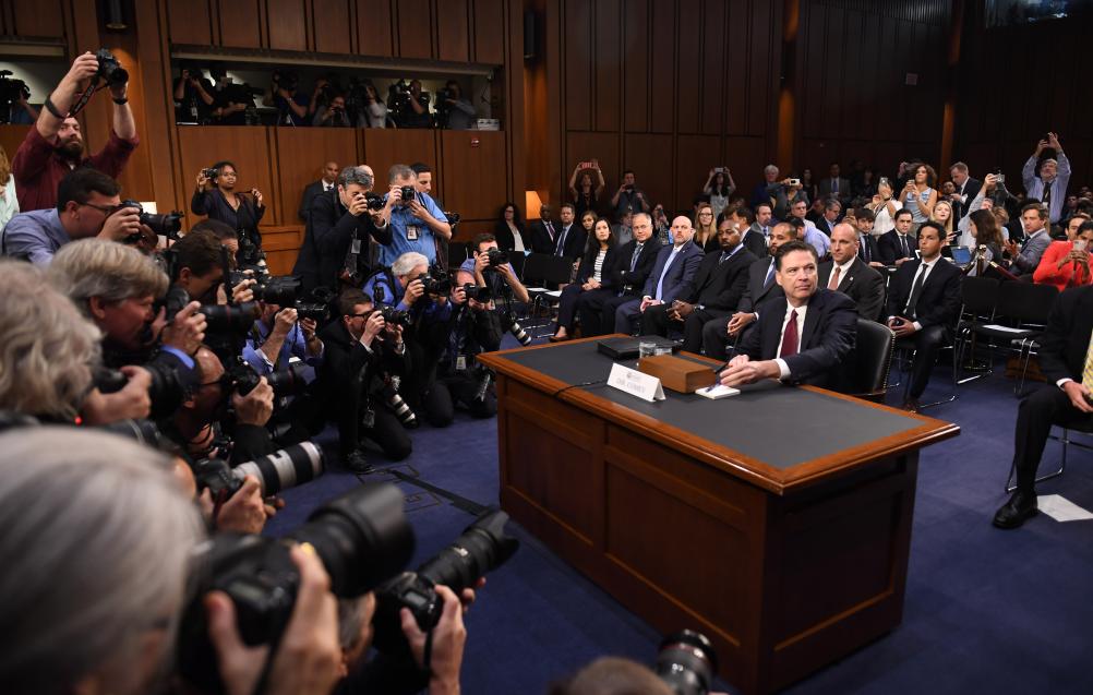 2017年6月8日,在美国华盛顿,美国联邦调查局(FBI)前局长詹姆斯·科米(中)在国会参议院准备出席听证会。新华社记者殷博古摄