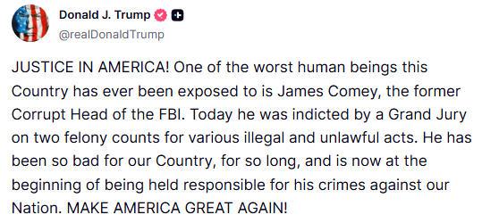 当天,特朗普借由社交媒体对这一消息表示“庆祝”,称科米“长期以来对美国非常坏”,现在“正义终于得到伸张”。就在数天前,特朗普还在社交媒体上发帖,抱怨司法部对科米的调查迟迟没有下文,要求尽快对科米提起诉讼。