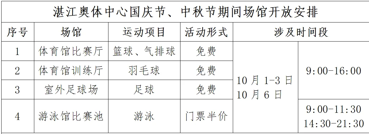 9月28日,中体体育产业发展(湛江)有限公司向广大市民发出《关于湛江奥体中心国庆节、中秋节期间免费开放的通知》:为丰富湛江广大市民节假日期间的文体生活,湛江奥体中心部分场馆在国庆节、中秋节期间(10月1日—3日和10月6日),实行对外免费开放或半价优惠。请大家自觉遵守场馆入场须知,开放期间如遇满场情况,请有序排队等待。