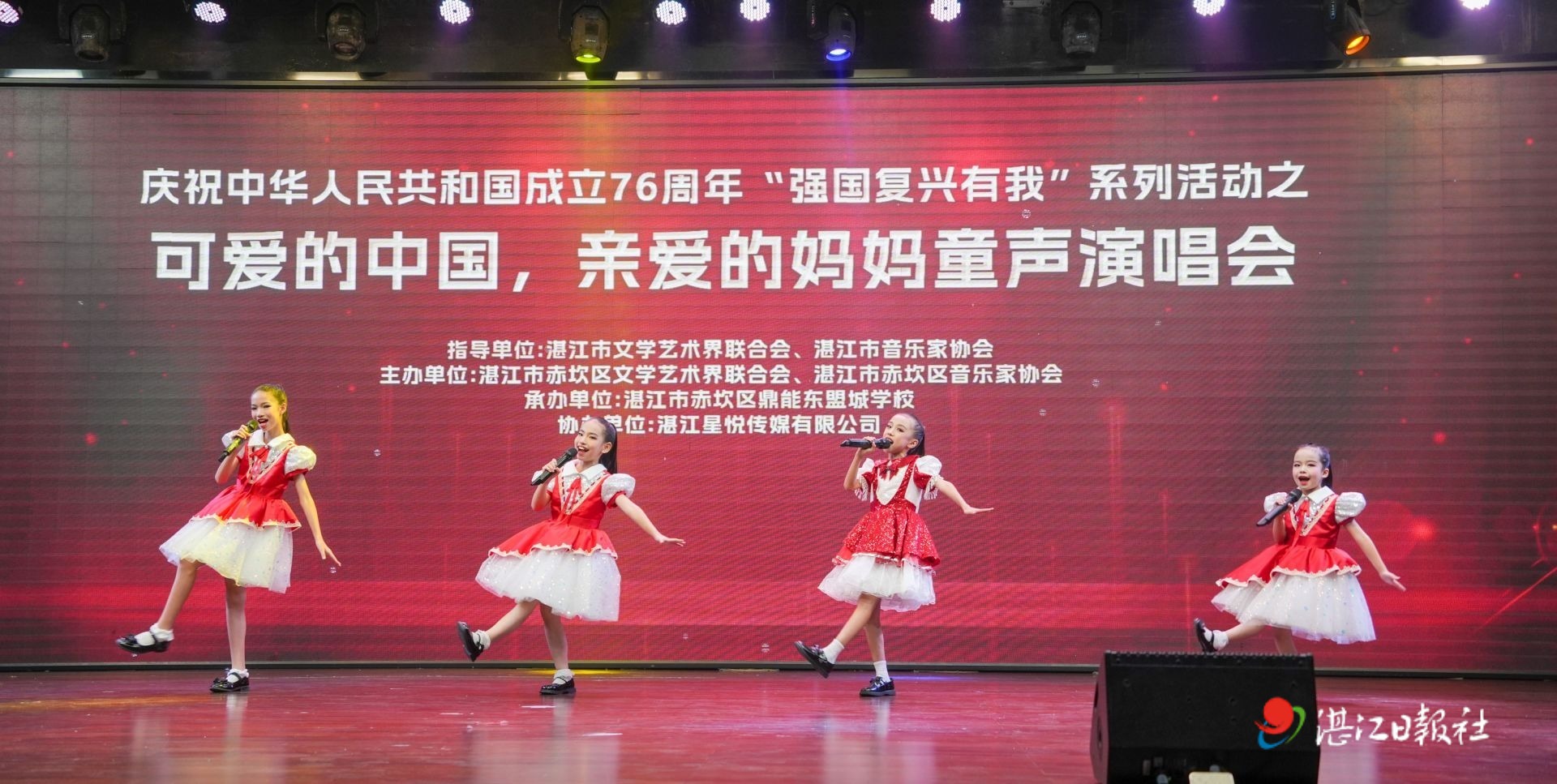 为庆祝中华人民共和国成立76周年,9月30日晚,由湛江市文学艺术界联合会、湛江市音乐家协会指导,赤坎区文学艺术界联合会、赤坎区音乐家协会主办的“可爱的中国,亲爱的妈妈”国庆主题童声演唱会在赤坎区举行。