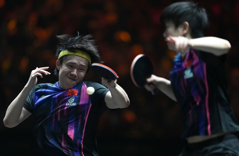 9月30日,王楚钦(左)/孙颖莎在比赛中。新华社记者 孙非 摄