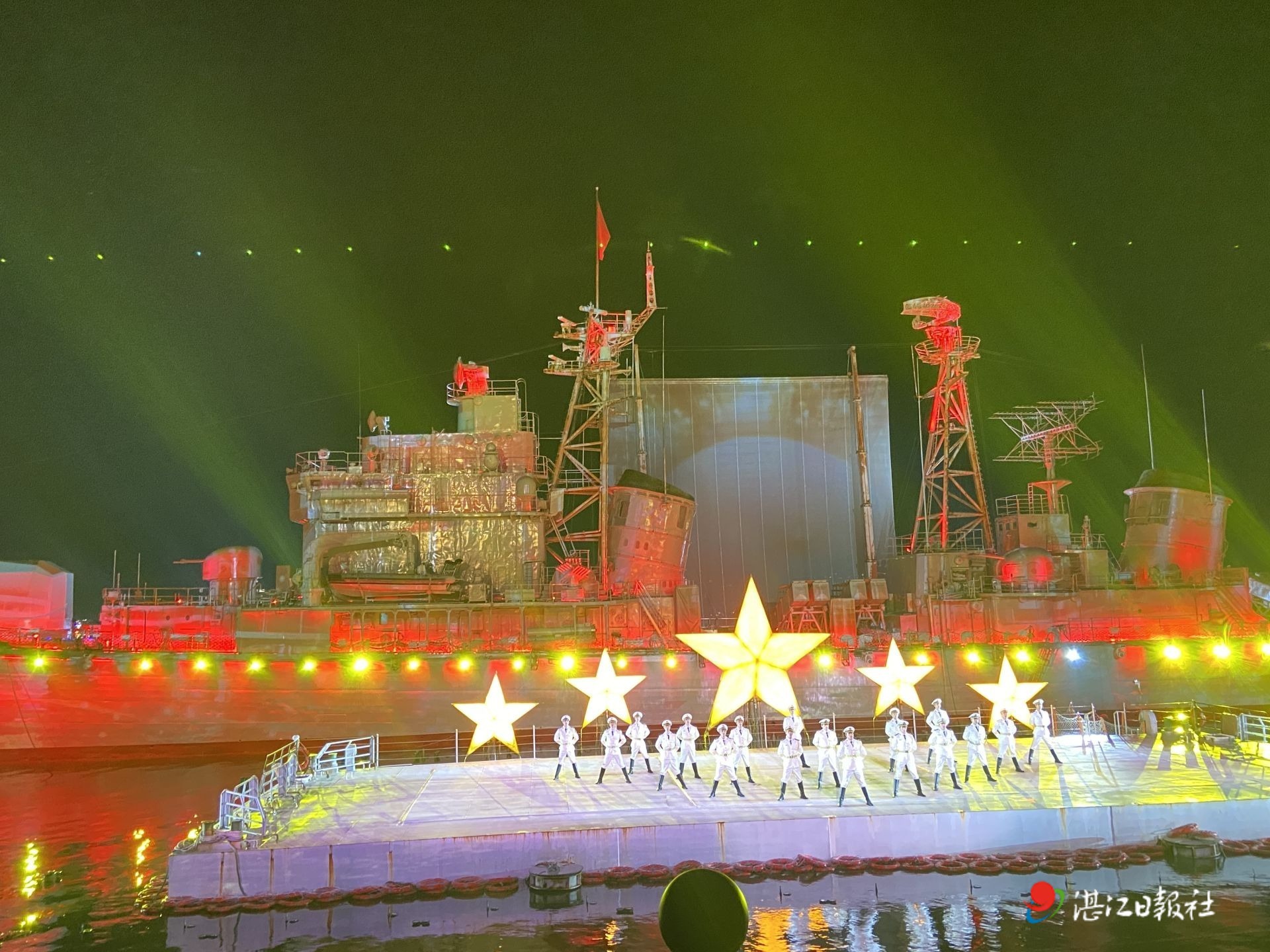 10月1日晚,湛江十里军港被星光与灯火点亮,退役165号湛江舰静静矗立在海面,成为全场最特别的“舞台背景”。随着悠扬的旋律与沉浸式场景的出现,我国首部军舰题材海上实景演艺《军港之夜》正式开演。