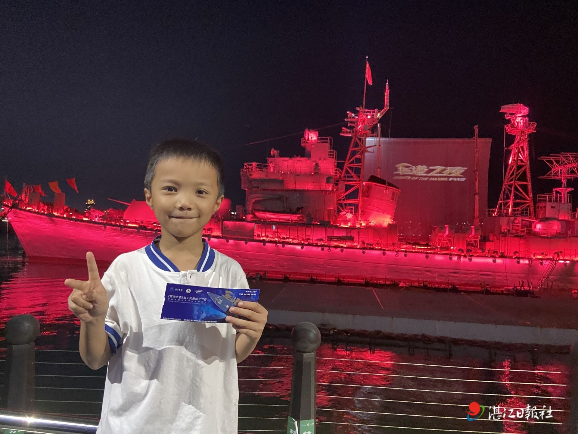 不仅是亲子家庭,许多游客也专程为这场演出而来。来自广西的游客李先生表示,原本计划在湛江逛沙滩、吃海鲜,偶然得知《军港之夜》演出后特意调整行程,“没想到能在国庆夜与退役军舰‘对话’,既放松了心情,又了解了湛江的军港文化,这个假期太有意义了。”