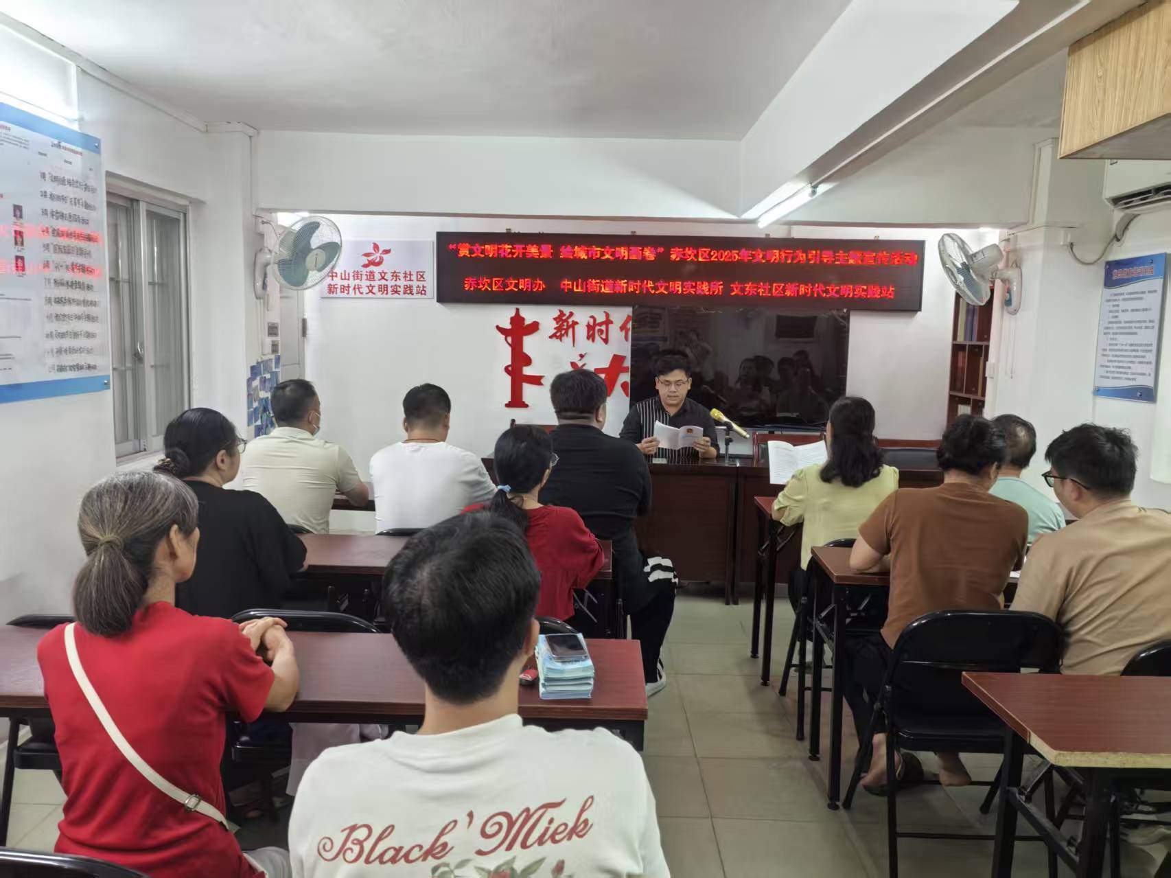 近日,赤坎区文明办牵头中山街道新时代文明实践所、文东社区新时代文明实践站开展“赏文明花开美景 绘城市文明画卷”主题宣传活动,辖区内商户及居民群众踊跃参与。